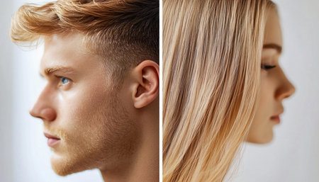 Close up profile of male and female models showcasing healthy hair and skin, ideal for beauty, cosmetics, or healthcare campaigns