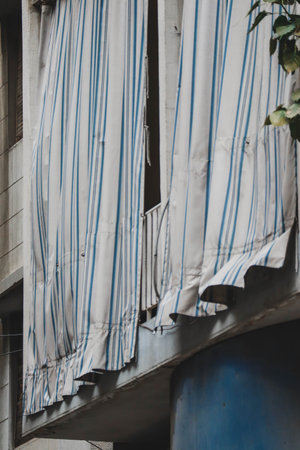 The background of the curtains on the green building window is dreamy because it is exposed to the sun