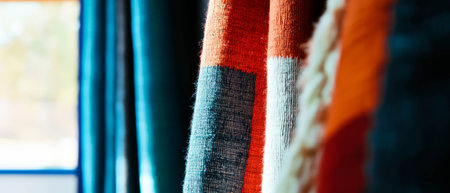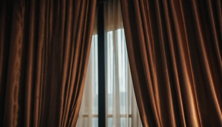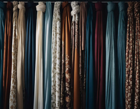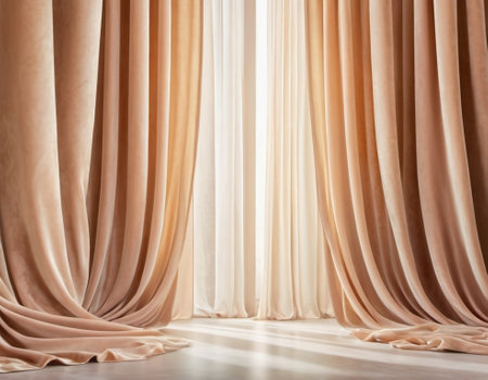 A collection of curtains drapes gracefully, showcasing a blend of rich colors and textures. The fabric panels catch soft daylight, enhancing the room's inviting atmosphere. Generative AI.