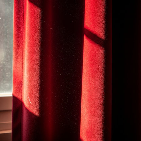Sunlight filters through elegant red curtains, casting soft shadows on the floor. The rich color adds warmth and vibrancy to the bright, inviting space.