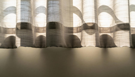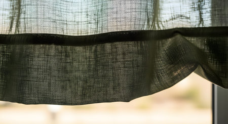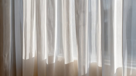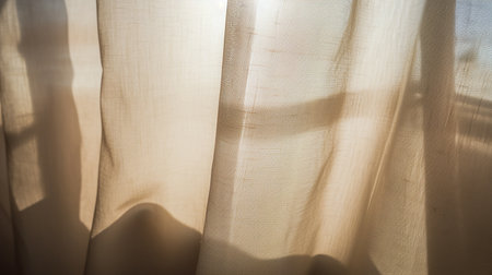A serene scene featuring soft curtain fabric gently swaying in sunlight. The delicate texture enhances the tranquil ambiance, perfect for cozy interiors.