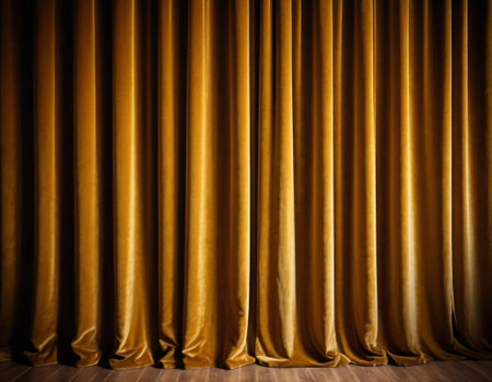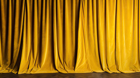 Curtain with soft smooth flowing folds. Deep golden color and luxurious texture create a dramatic and elegant atmosphere. Decoration and interior design. Expensive curtain made of rich fabric. AI.