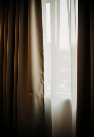 Dark room with golden brown curtains. Morning light streaming through tulle. Wake up background. POV waking up in the morning. Soft focus. film grain pixel texture. Defocused.