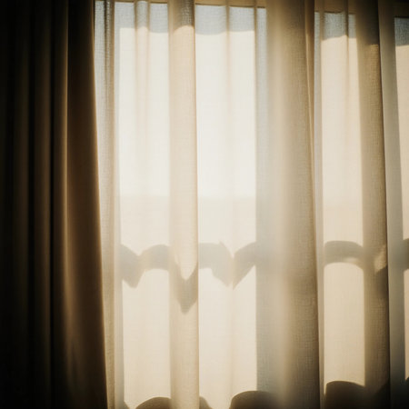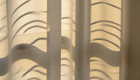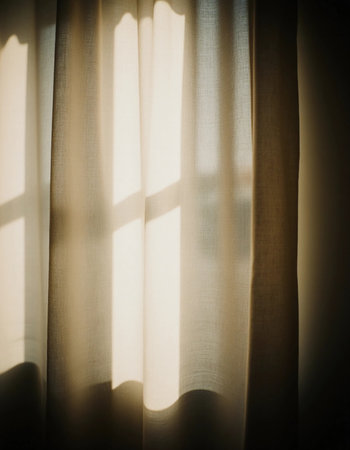 Soft sunlight filters through beige curtains, creating gentle patterns and shadows in a calming indoor environment during the day.
