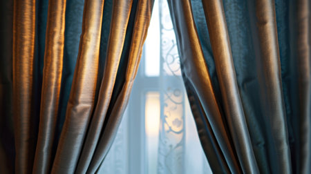 Silk curtains cascade gracefully from a window, embracing the soft sunlight that filters through.