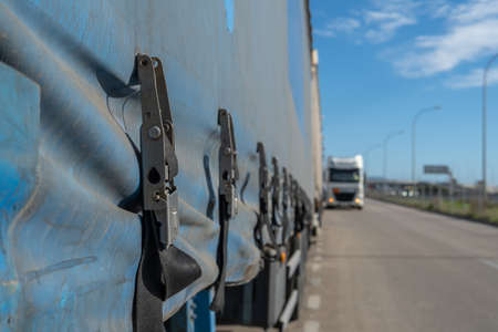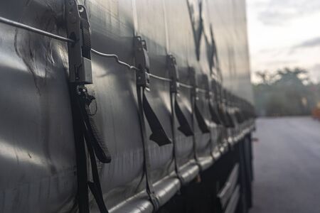 Truck transport. View of the tarpaulin covering the semi-trailer of the truck.