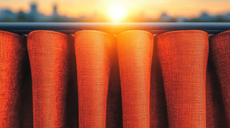 Soft orange curtains catch warm sunset light, creating a cozy and tranquil atmosphere in an inviting indoor space. Ideal for home decor visuals.