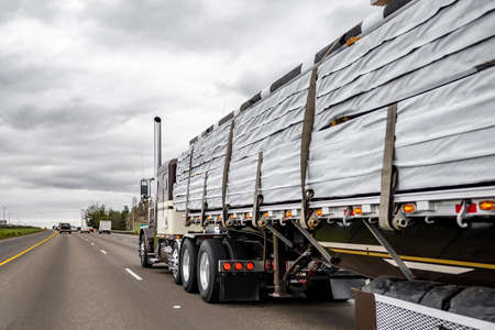 Dark classic American idol big rig industrial semi trucks tractor with chrome vertical pipes transporting covered lumber wood on flat bed semi trailer running on the straight wide highway road