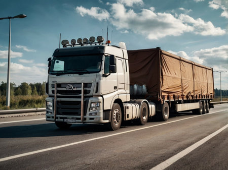 Truck with trailer on the highway. Transportation of goods and cargo.