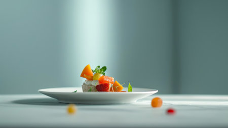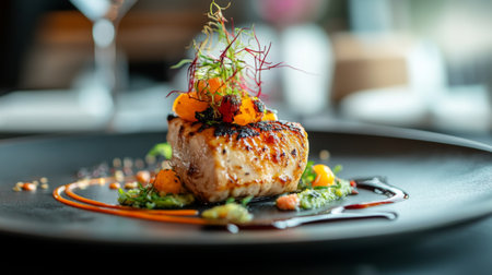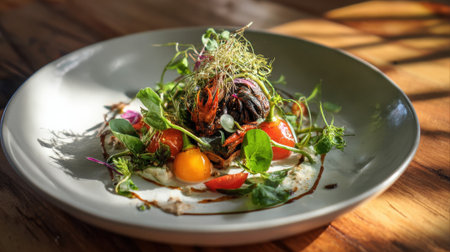Discover a visually stunning gourmet meal artfully presented on a sleek plate, showcasing fresh ingredients and elaborate garnishes in a professional studio setting.