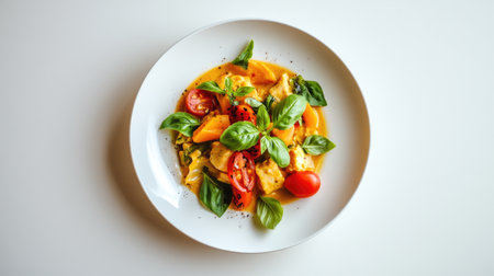 A vibrant dish featuring fresh pasta topped with basil and cherry tomatoes, showcasing a colorful array of vegetables, perfect for a healthy meal.