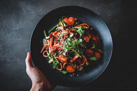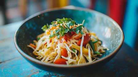 A vibrant bowl of freshly prepared vegetable salad with noodles and herbs, showcasing a colorful and appetizing meal ideal for a healthy dining experience.