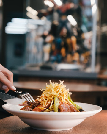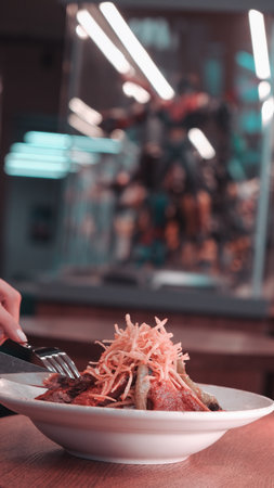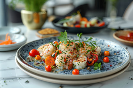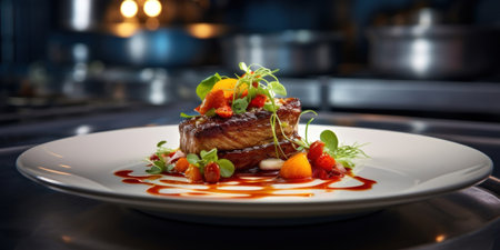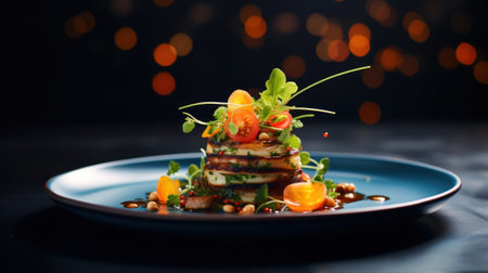 Culinary art is a harmonious combination of fresh ingredients of the highest quality. The elegant fusion showcases the chef's attention to detail. The background is softly blurred, drawing attention to the culinary masterpiece in the foreground.