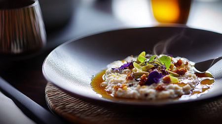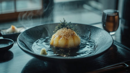 A beautifully plated gourmet dish featuring steam rising from the rich flavors. This artistic creation highlights the blend of culinary techniques and aesthetic presentation, inviting a delightful dining experience.