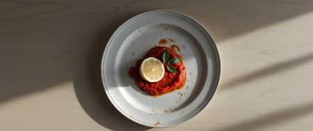 AI Generated. dirty plate dinning plate with leftover tomato sauce and lemon on table