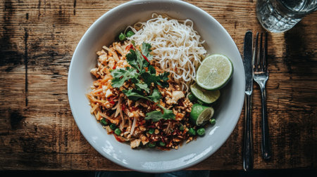 A vibrant bowl of Thai noodles garnished with fresh vegetables, lime slices, and colorful flowers, served on a rustic wooden table. Ideal for food lovers.