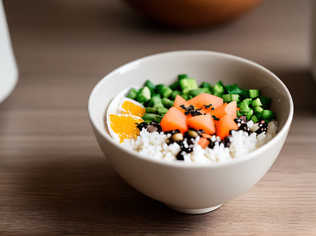 Cozy restaurant features a highdetail neutralcolored poke bowl with warm lighting and a closeup view for a realistic feel. Nobody present. Generative AI Generated
