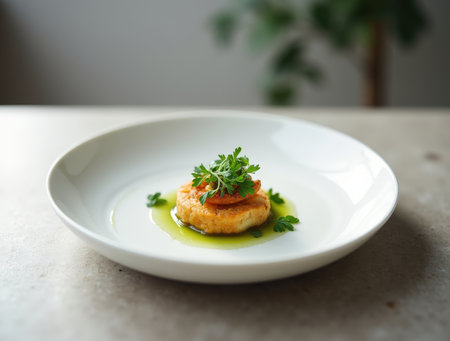 Delicious appetizer served on an elegant white plate in a restaurant.