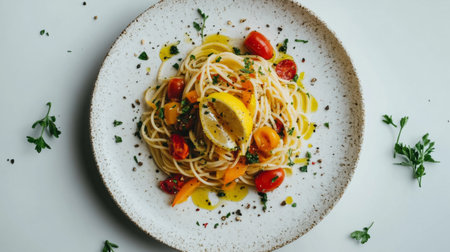 A beautifully presented plate of spaghetti topped with cherry tomatoes, slices of lemon, and fresh herbs, showcasing vibrant colors perfect for any food lover. Enjoy the delightful flavors!