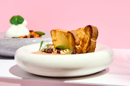 Pate with Bread on white plate. Restaurant appetizer plate on white table with pink wall. Day sunlight with hard shadow of fern palm leaves. Summer or spring restaurant food concept