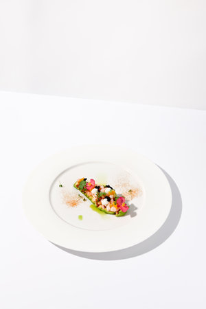 Gourmet avocado with shrimp tartare, mango, cream cheese, and black caviar on a pristine white plate.