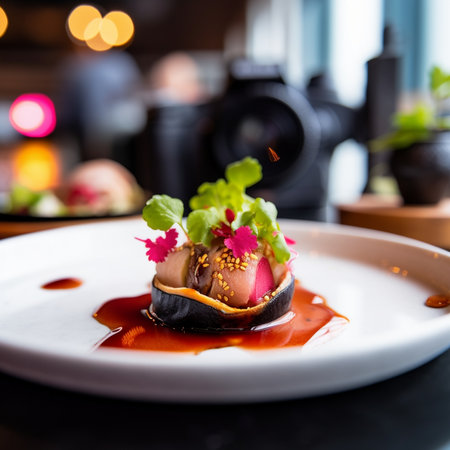 A captivating scene featuring a gourmet dish being photographed, highlighting fresh ingredients and artistic presentation on a wooden table, embodying culinary creativity.