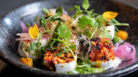 A vibrant and beautifully arranged dish featuring grilled scallops topped with fresh herbs, edible flowers, and colorful garnishes, ideal for food lovers.