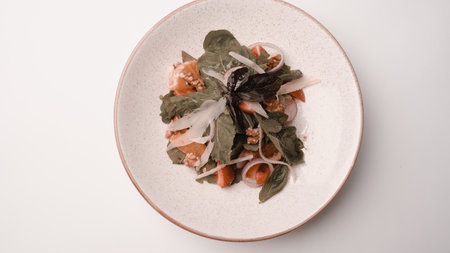A white plate with a salad on it. The salad is made up of various vegetables and has a nice presentation