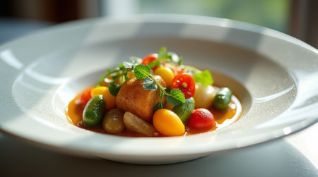 An exquisite dish featuring assorted colorful vegetables and tender herbs, presented in a sophisticated manner at a restaurant during lunchtime.