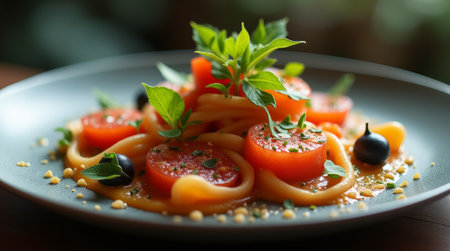 Spaghetti is beautifully plated with ripe tomatoes, olive oil, and fresh herbs, creating a vibrant and appetizing dish in a warm restaurant setting.