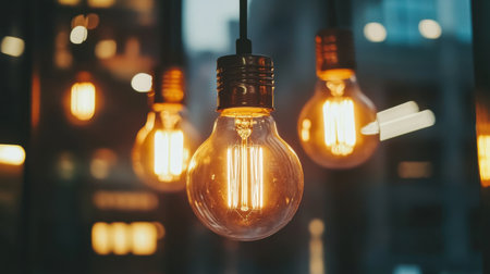 Illuminated vintage Edison light bulbs create a warm ambiance in an urban setting, perfect for enhancing creative projects or interior designs with a stylish touch.