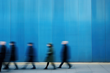 Business people walking in front of a blue wall. Intentional motion blur