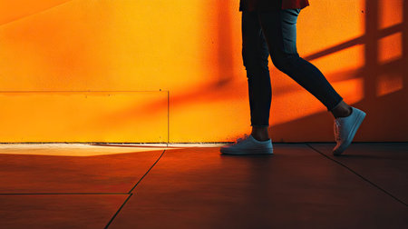 A person walks gracefully on a sleek floor, creating a dynamic silhouette against a striking bright orange wall. The sunlight casts intriguing shadows.