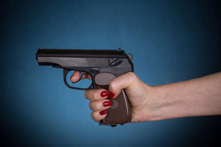female hand holding gun over dark blue background