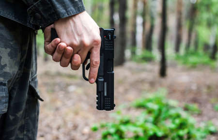 Strong Men's hands hold a gun against forest background. Danger situation in the forest
