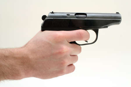 Black 9mm gun in man's hand aiming