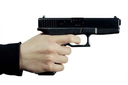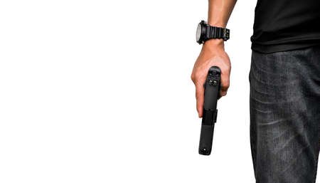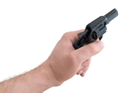 Gun in a man's hand is isolated on white background.