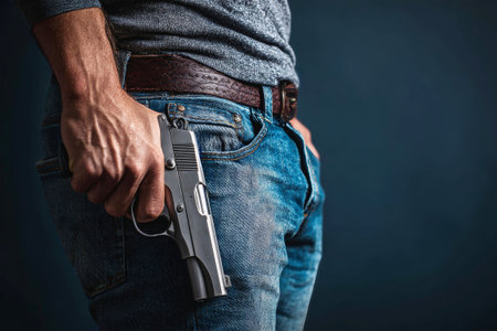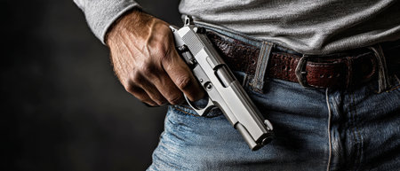 A man grips a silver handgun near his waist, showing focus and intent. The contrast of the dark background creates a striking visual tension.