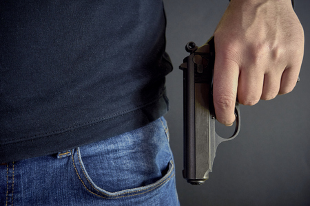 Man in grey cloth holds firearm behind his back. Revolver in mens hand. Person ready to attack with hand gun. Criminal concept.