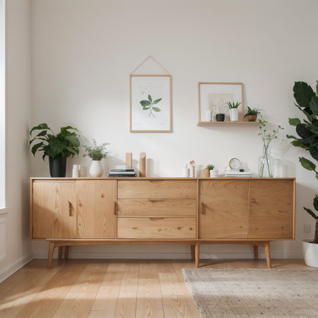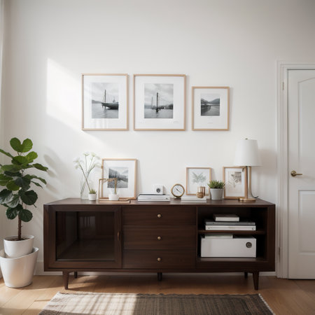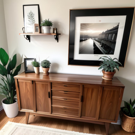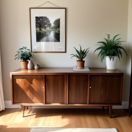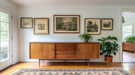 Bright and inviting living room scene featuring a stylish wooden sideboard, tasteful vintage artwork, and lush indoor plant, creating a cozy yet modern atmosphere.