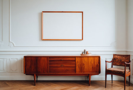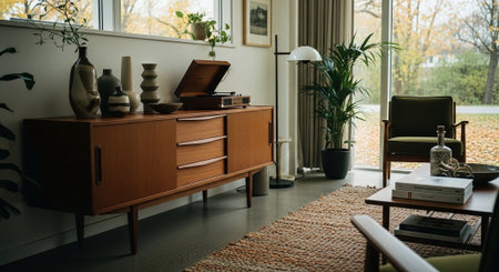 A mid-century modern interior features wooden furniture against a white wall, illuminated by natural light