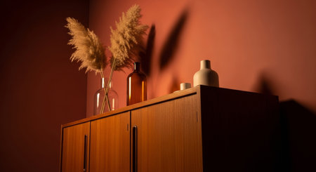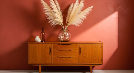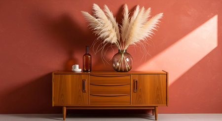 A warm-toned wooden mid-century modern sideboard is positioned against a terracotta-colored wall. A large glass vase filled with fluffy pampas grass is placed on top, alongside a dark glass bottle and a small white cup and saucer. A diagonal shaft of sunlight casts a shadow across the wall and the furniture.