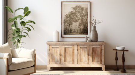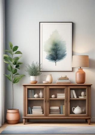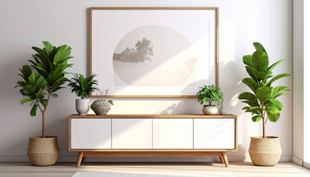 Interior of modern living room with wooden commode, plants and poster