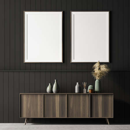 Living room interior with a cozy wooden sideboard. White wall is decorated with two vertical poster. Minimalistic designer decision represents modern way of decoration. Mock up. 3d rendering