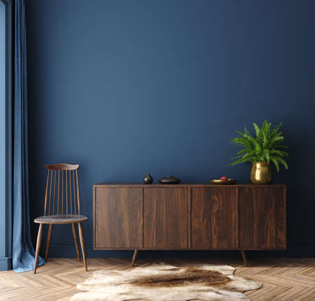 Commode with chair and decor in living room interior, dark blue wall mock up background, 3D render