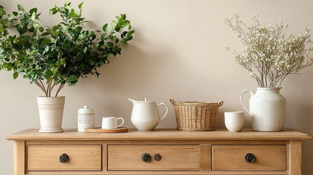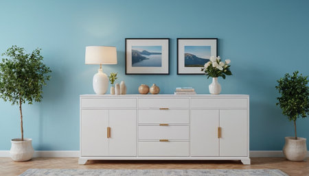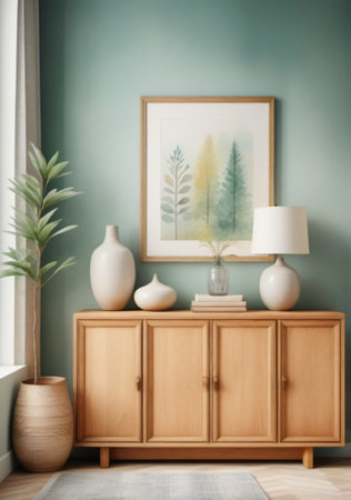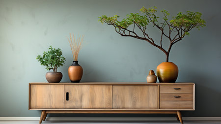 Interior of modern living room with wooden commode, vase and decoration