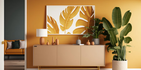 Stylish interior design of living room with sideboard table, tropical plant in ceramic pot, Mock up poster frame on the ginger color wall. Template. Home decor. 3D Rendering