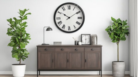 Statement wall clock mounted above a modern sideboard styled with home accessories