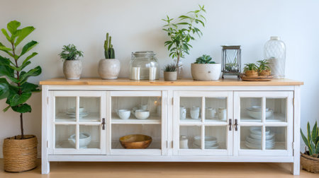 This image features a beautifully arranged cabinet showcasing a collection of tableware and charming plants, creating a refreshing and inviting home environment.