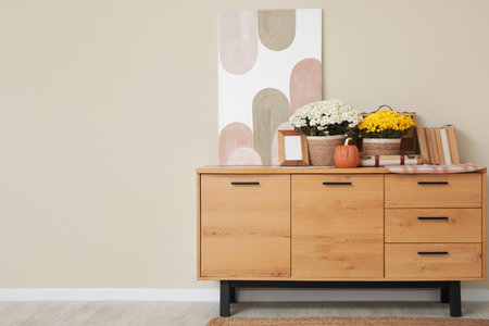 Chest of drawers with chrysanthemum flowers, picture and decor in interior of living room